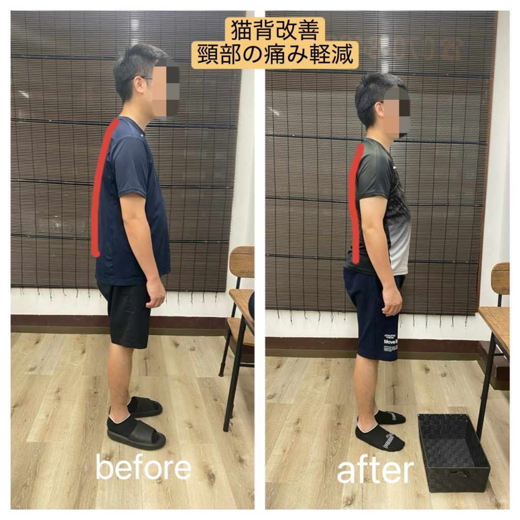 初回は、猫背の原因となっていた胸まわりと肩甲骨の動きから改善。胸の筋肉をゆるめ、肩が自然に引けるように調整したことで、首の負担が軽くなりました。胸椎(背中の骨)の硬さを改善するセルフケアを指導し首が無理に前に出る姿勢を修正。デスクワーク中の姿勢アドバイスと体幹の安定性を高める簡単なトレーニングを一緒に行いました。